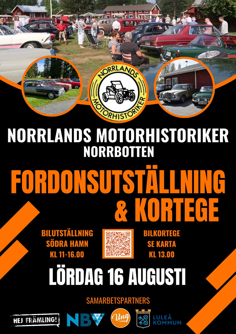 Norrlands Motorhistoriker Norrbotten bjuder in till bilutställning i Södra hamn 16 augusti kl. 11-16.